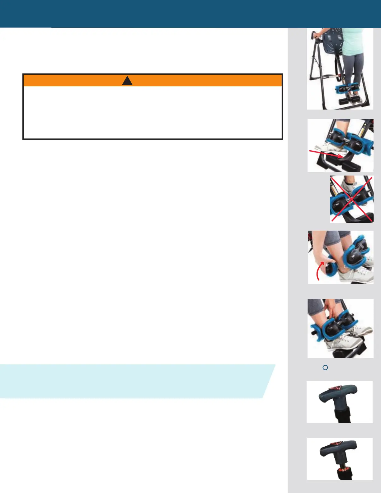 Employ the method of “HEAR, FEEL, SEE, TEST” every time you secure your ankles in the inversion table: