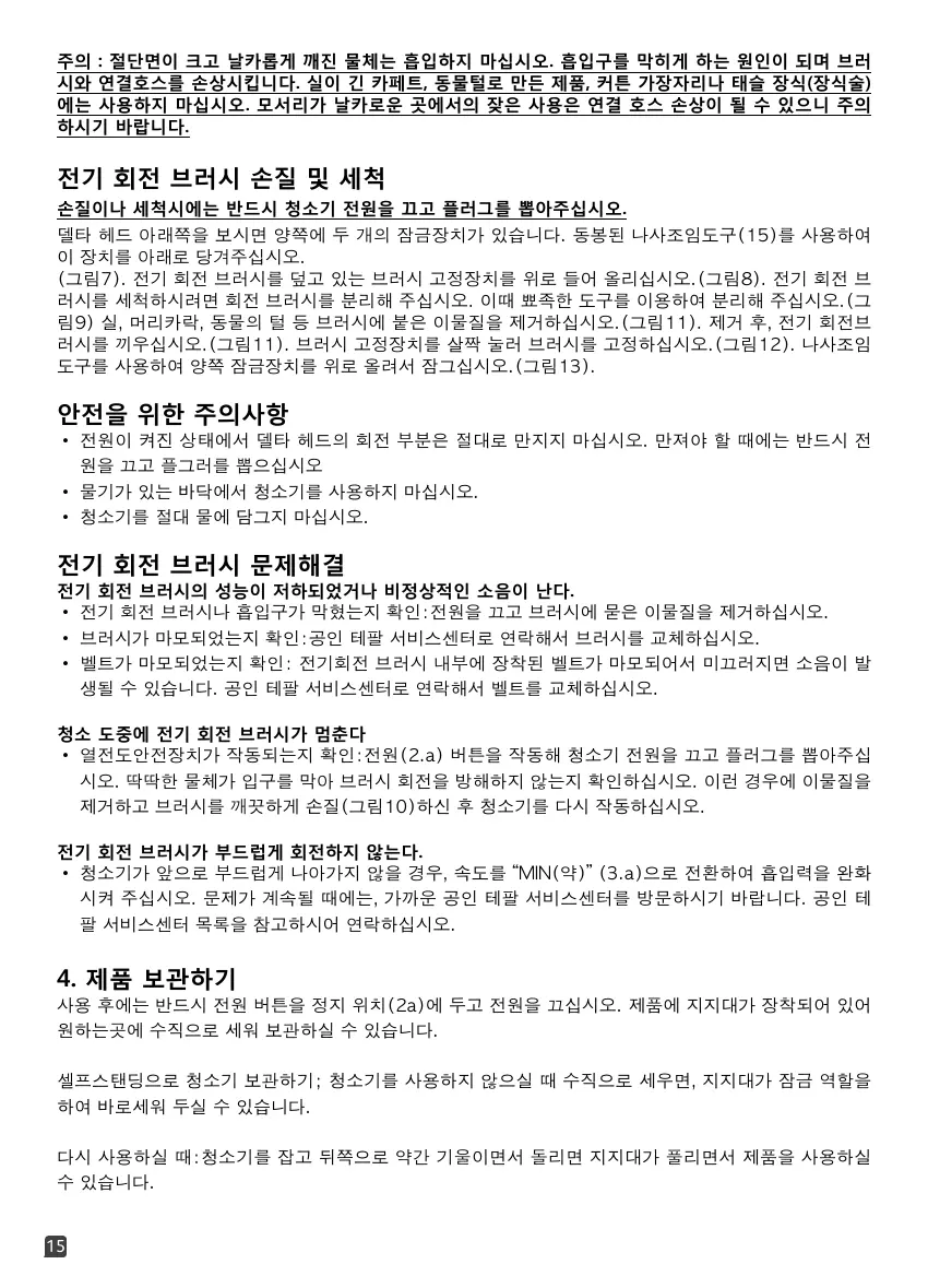 주의 : 절단면이 크고 날카롭게 깨진 물체는 흡입하지 마십시오. 흡입구를 막히게 하는 원인이 되며 브러