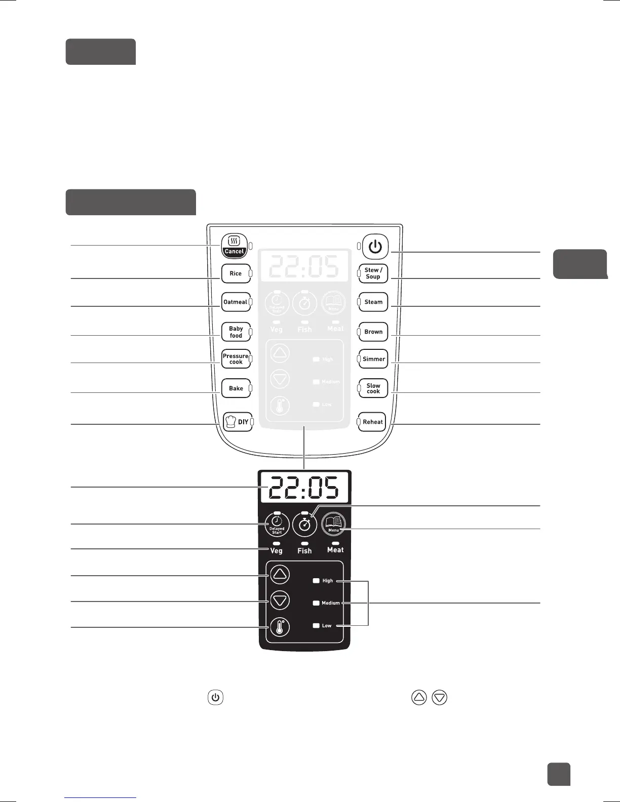 „Gőzölés”, „Pörkölt/leves”, , „Késleltetett indítás”, „Időzítő”, „Menü”, , , „Hőmérséklet”.