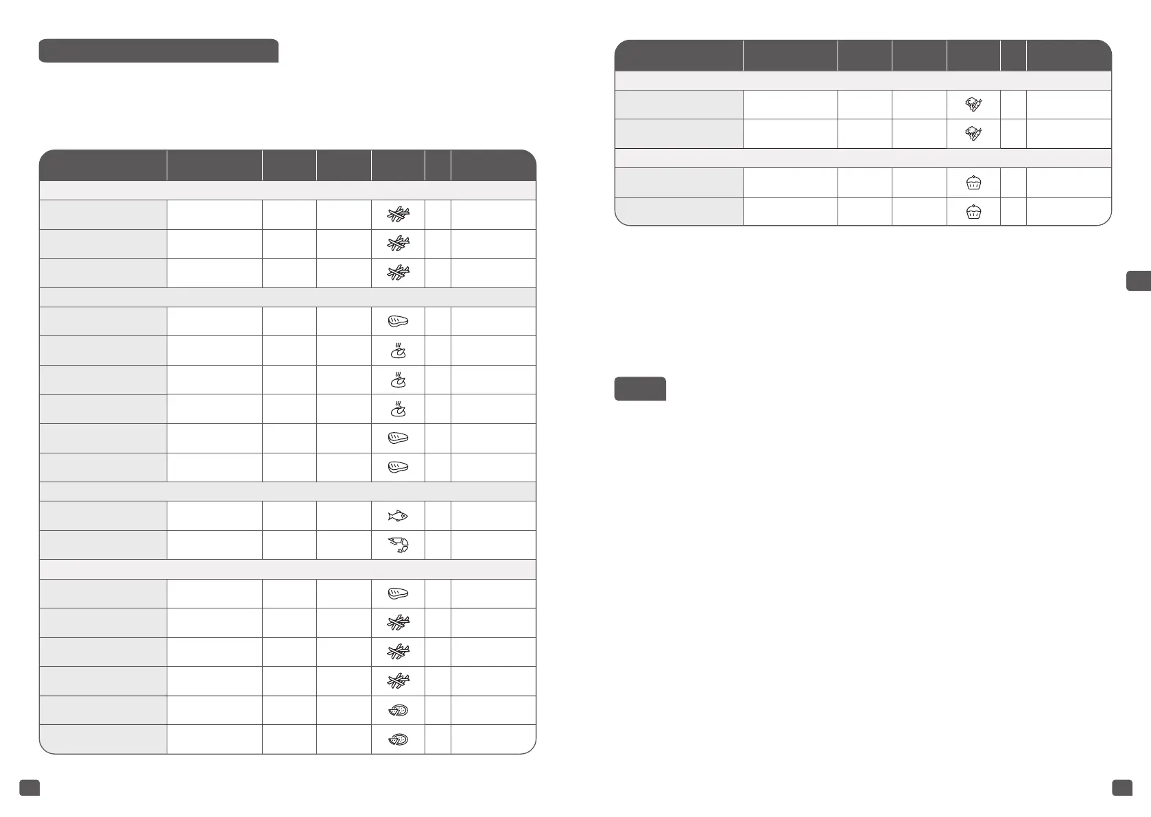 Tabellen nedenfor hjelper deg med å velge enkle innstillinger for ingrediensene du vil tilberede.