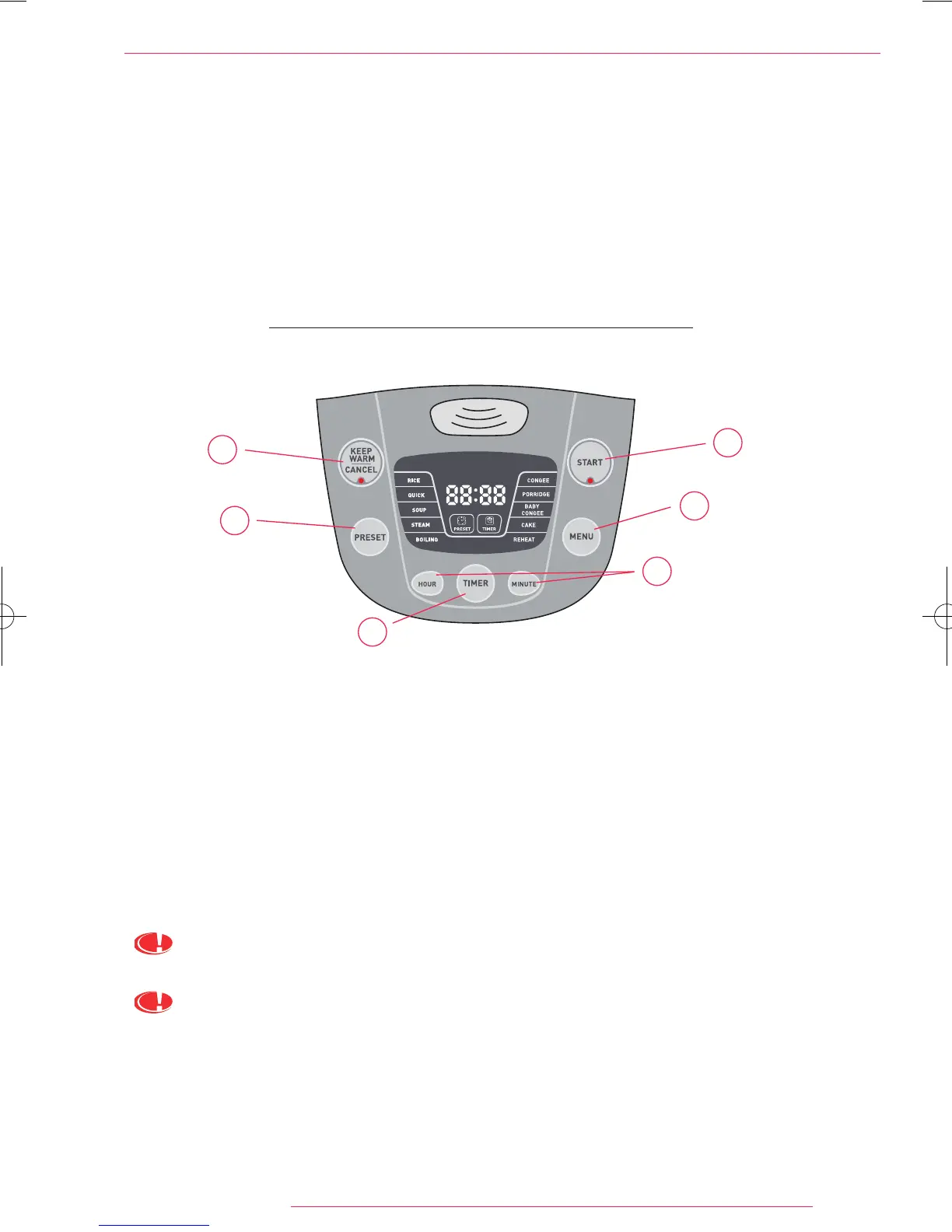 B KEEP WARM/CANCEL: keep warm function works automatically after each cooking period. Press of this