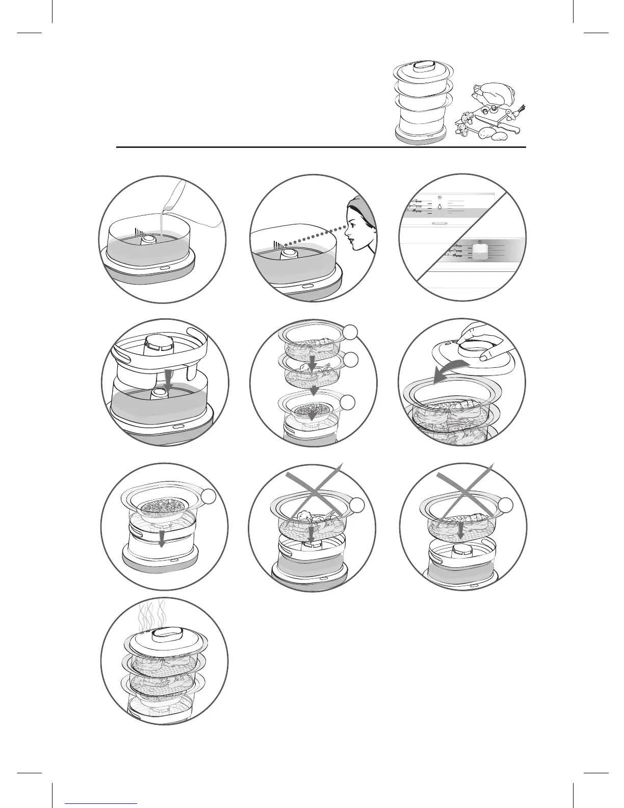 TEFAL MINI COMPACT VC1352 - Operating the Steamer; Adding Water and Setting Timer; Assembling and Loading Steamer Bowls