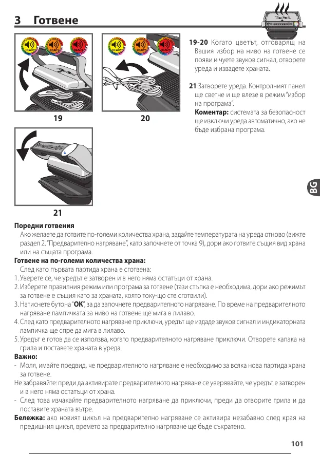 - Моля, имайте предвид, че предварителното нагряване е необходимо за всяка нова партида храна