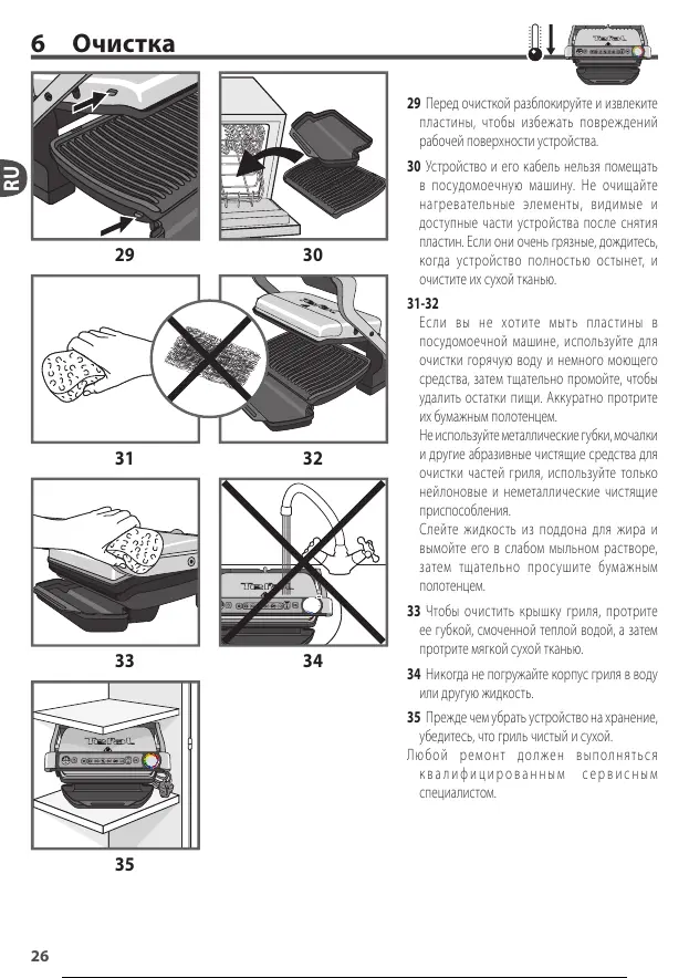 34 Никогда не погружайте корпус гриля в воду