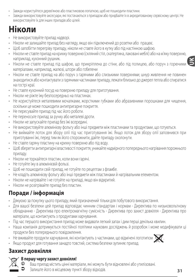 • Завжди користуйтеся дерев'яною або пластиковою лопаткою, щоб не пошкодити пластини.