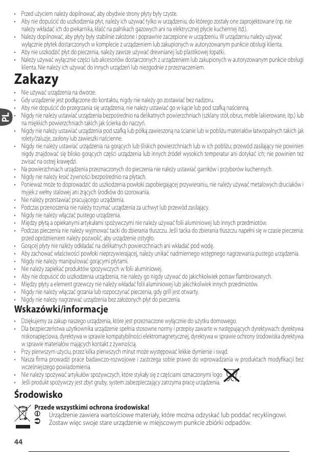 • Nigdy nie należy nagrzewać urządzenia bez założonych płyt do pieczenia.