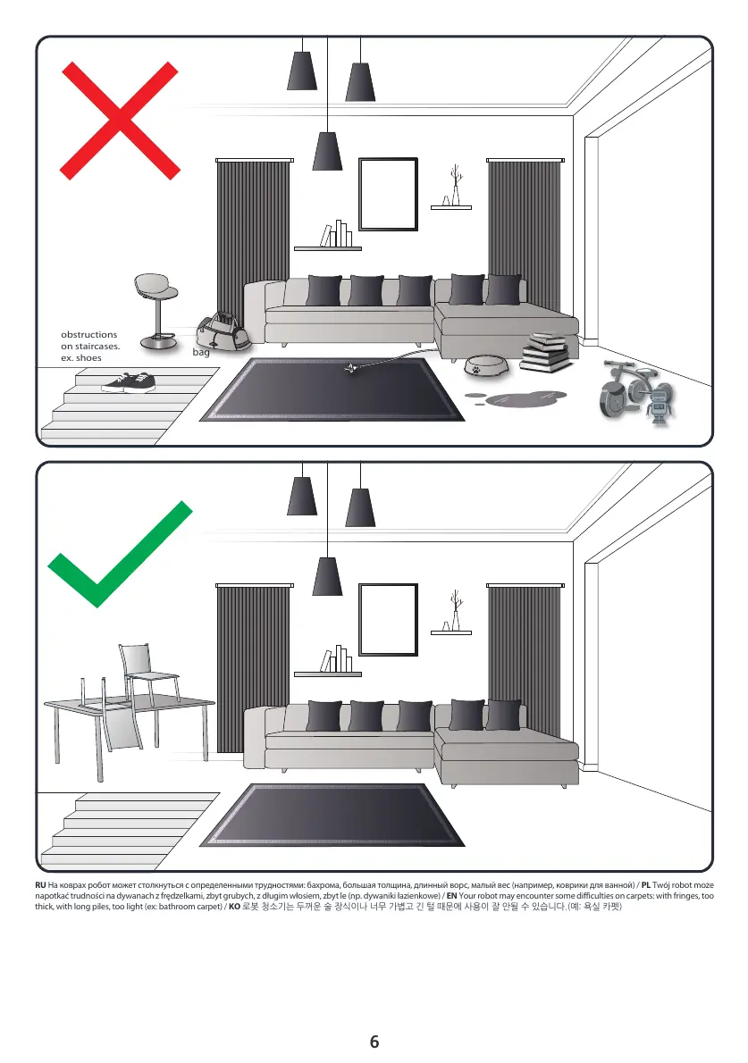 RU На коврах робот может столкнуться с определенными трудностями: бахрома, большая толщина, длинный ворс, малый вес (например, коврики для ванной) / PL Twój robot może