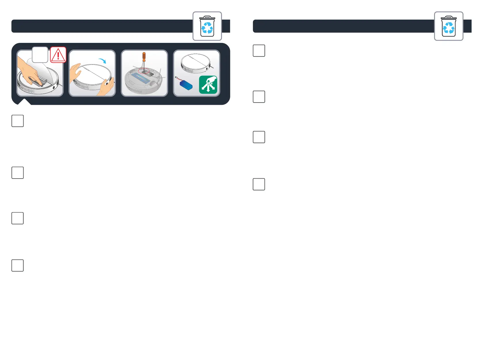 Atjunkite akumuliatorių nuo roboto. Perdirbkite akumuliatorių ir robotą.