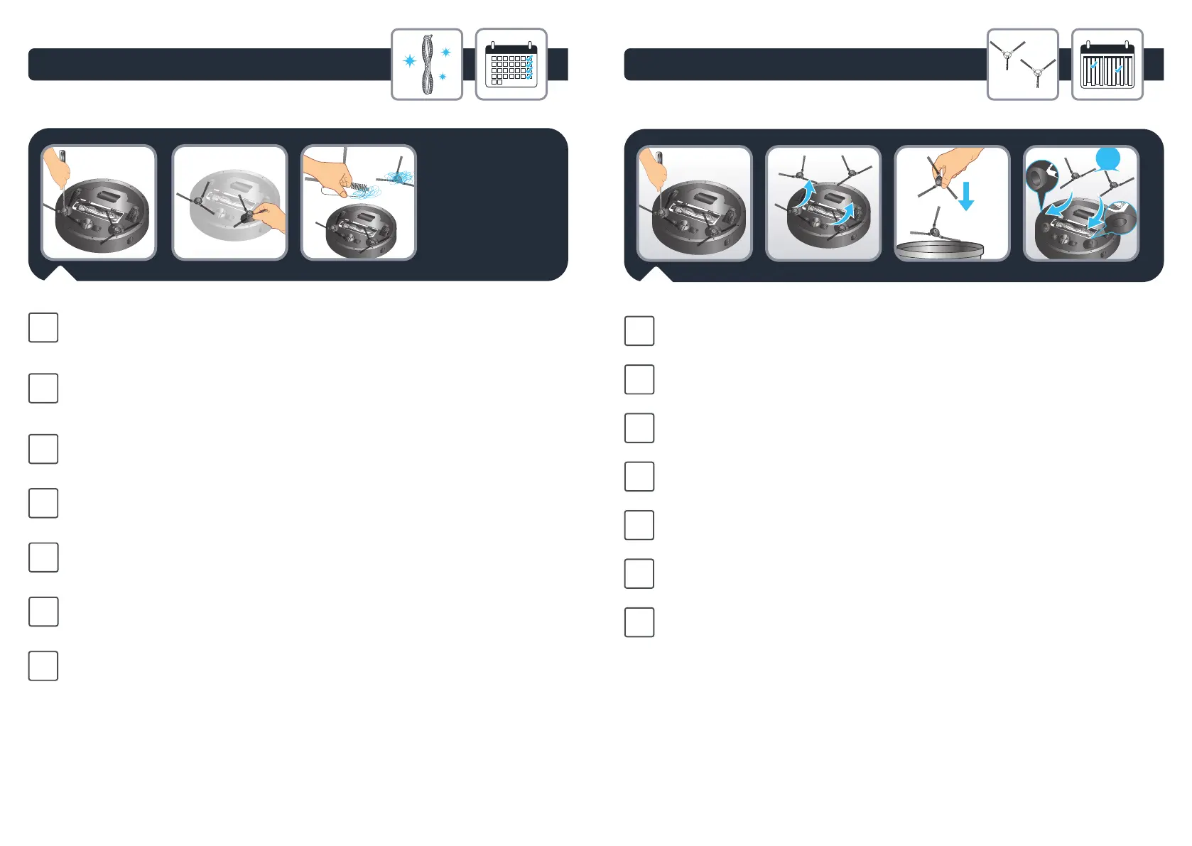 Yan fırçaları 6 ayda bir değiştirin. Eski fırçaları atın ve yenilerini takın. Yeni fırçaları robota vidalayın.