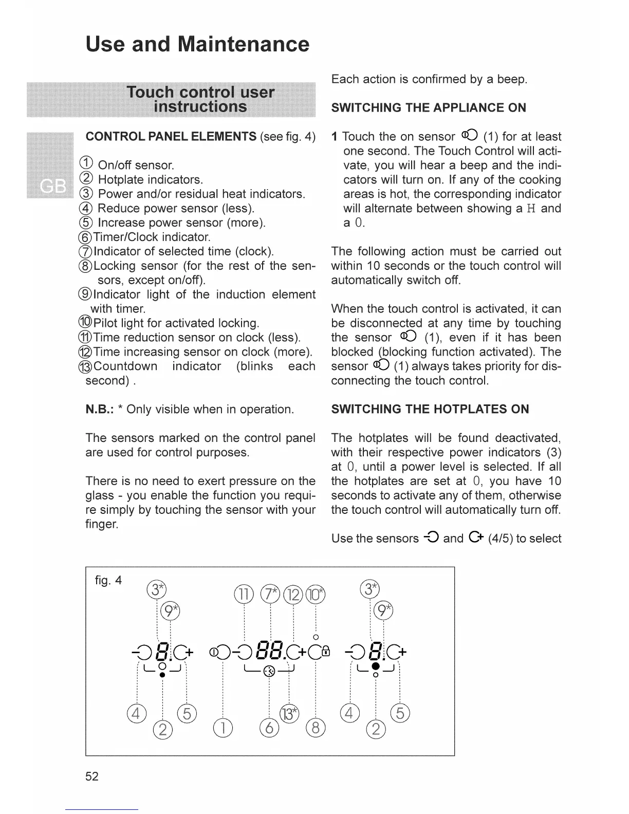 Teka IR-321 - Use and Maintenance; Touch Control User Instructions; Switching the Appliance On; Switching the Hotplates On