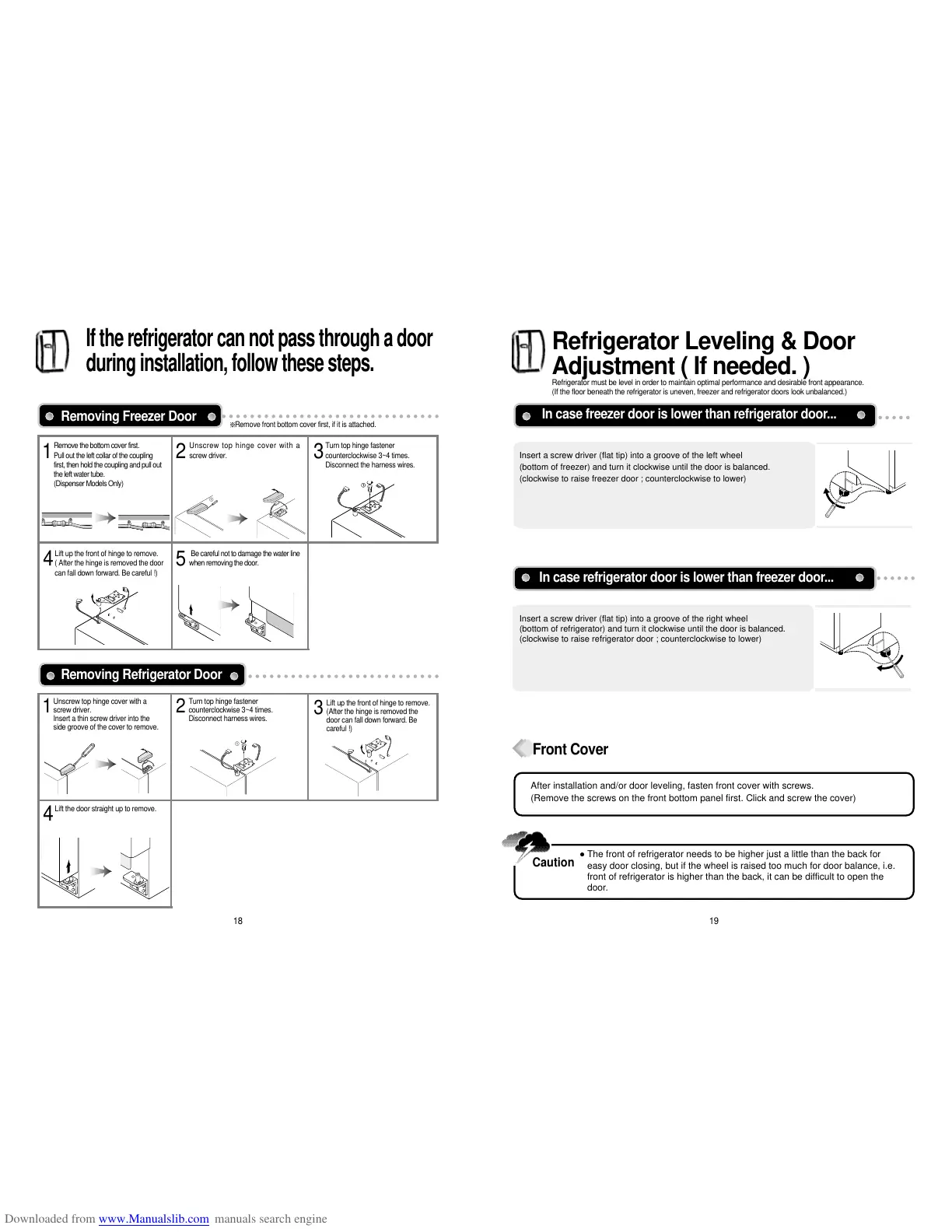 Teka NFD 650 - Refrigerator Leveling & Door Adjustment ( if Needed. ); If the Refrigerator Can Not Pass through a Door; Front Cover