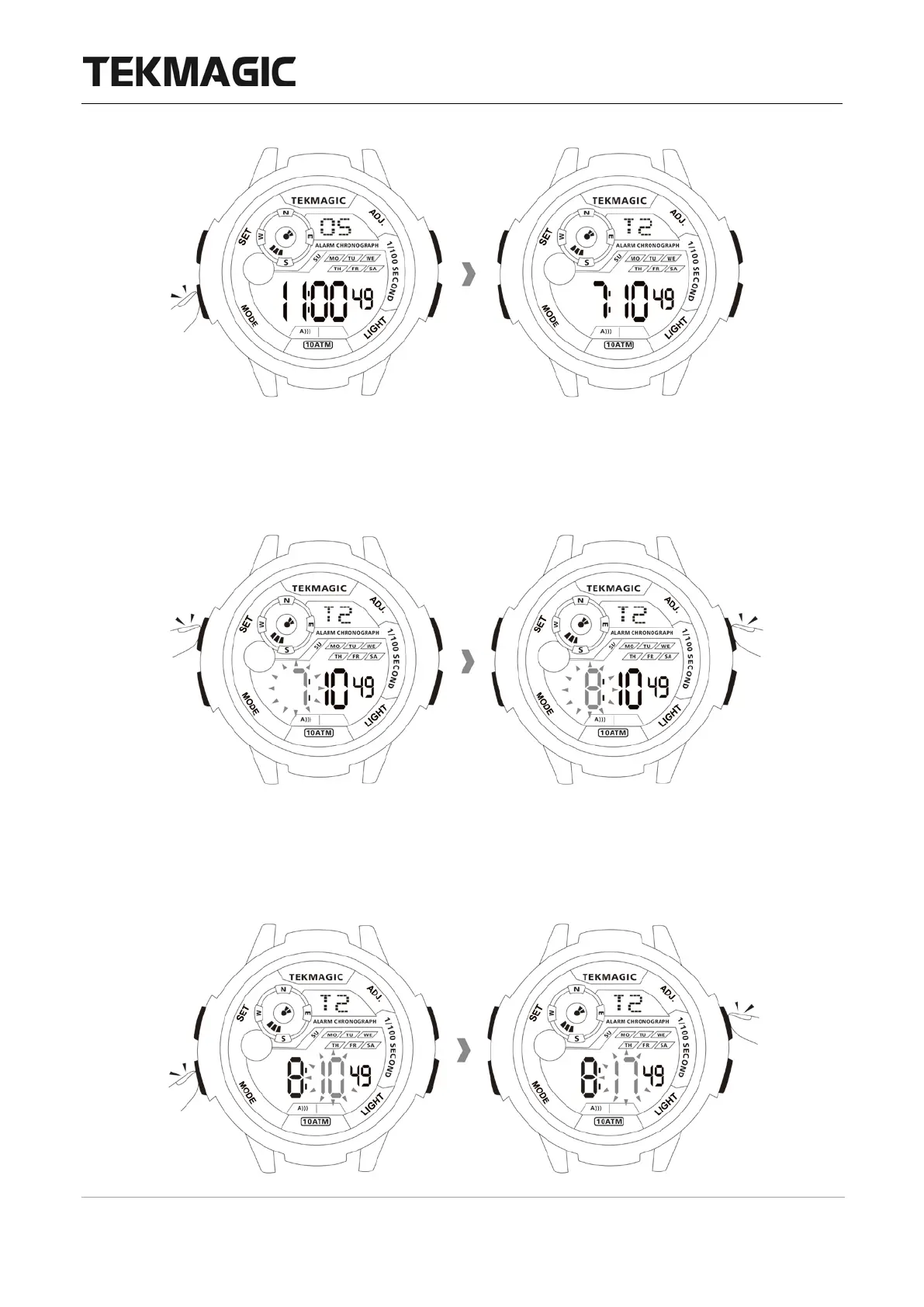 8.2 Hold down the SET button till you see the hour digit is blinking, press the ADJ button to