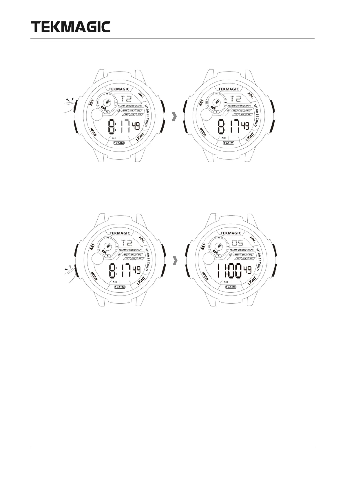 In the local time display mode, hold down the ADJ button to check the month and date