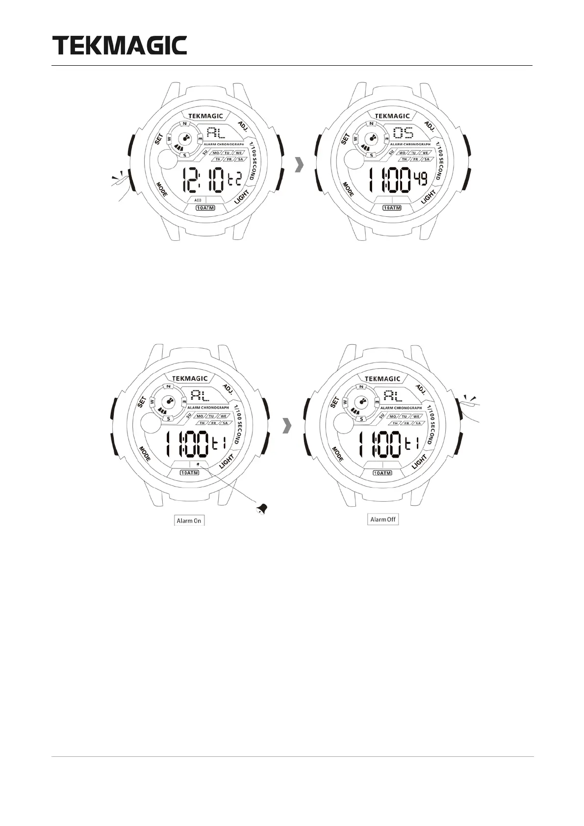 アラーム設定モードで、ADJ ボタンを押してアラームをオンまたはオフにします。