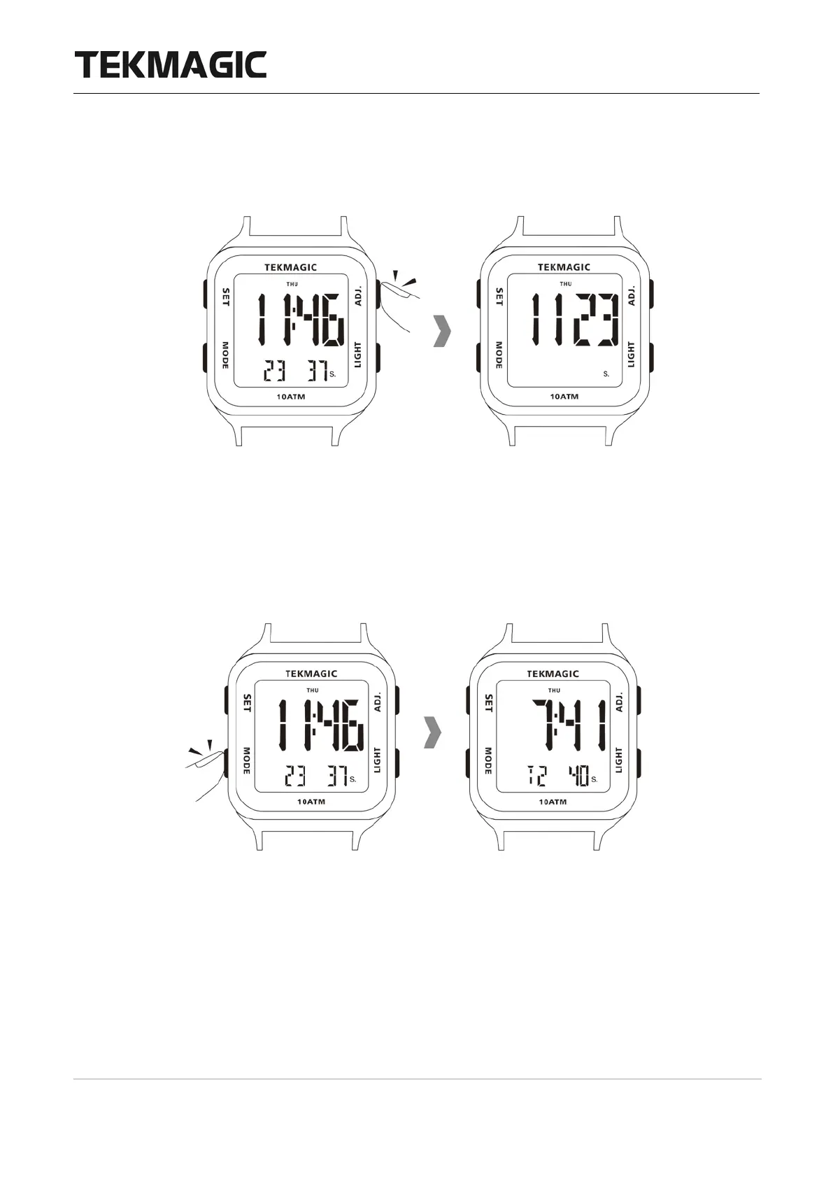 In the local time display mode, hold down the ADJ button to check the month and date.