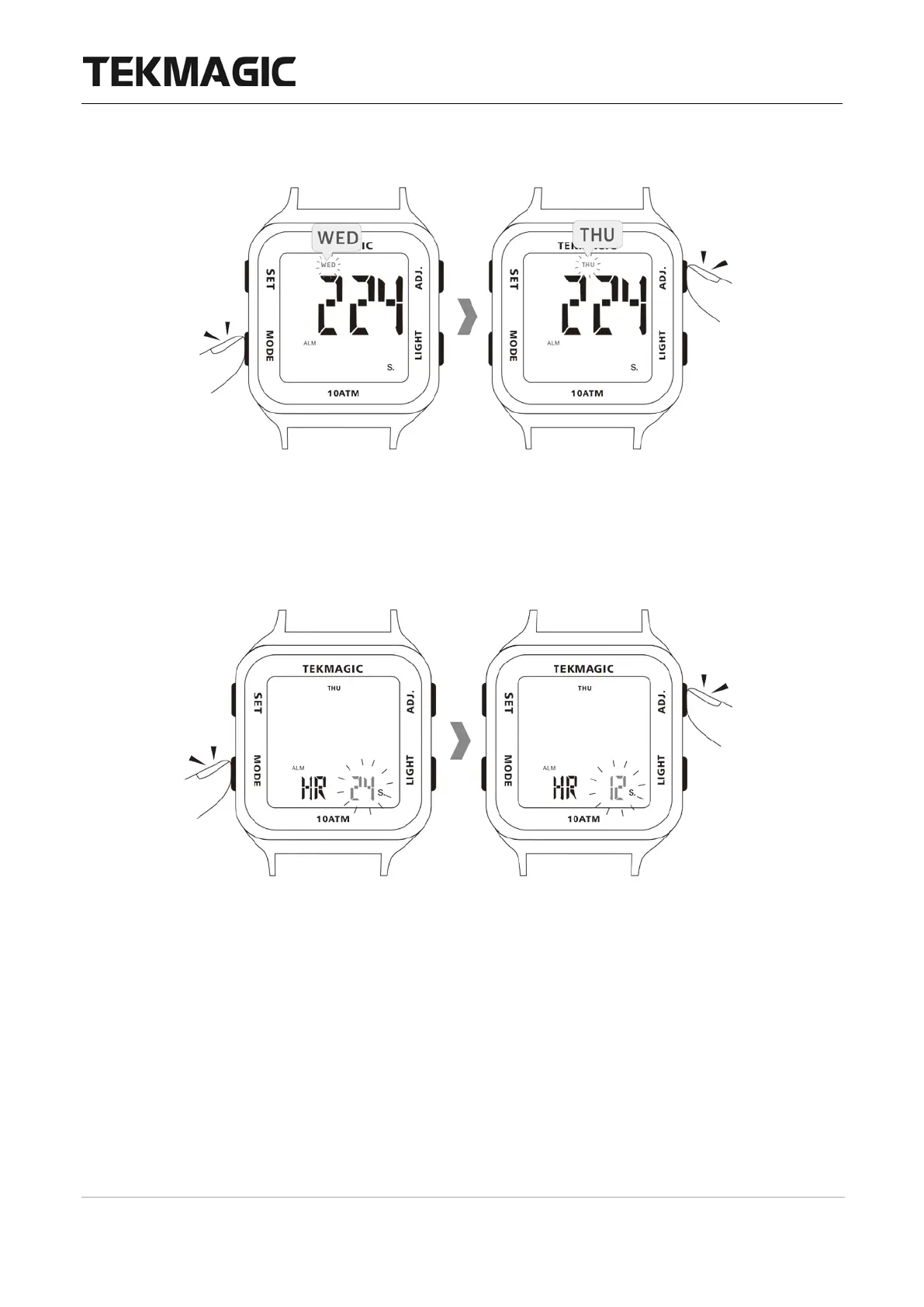 2.8 もう一度 MODE ボタンを押すと、時間形式の数字インジケータが点滅し始め、ADJ ボ