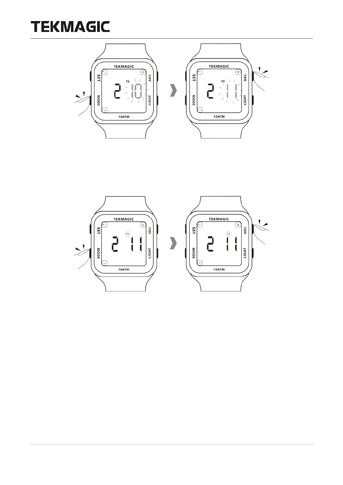 Sie dann die ADJ-Taste, um den Wochentag auszuwählen.