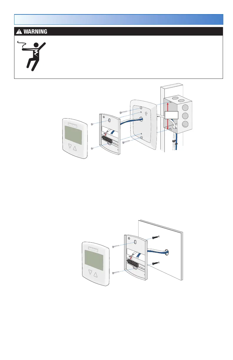 • Fasten the thermostat base to the wall using the wood screws to the wall anchors.