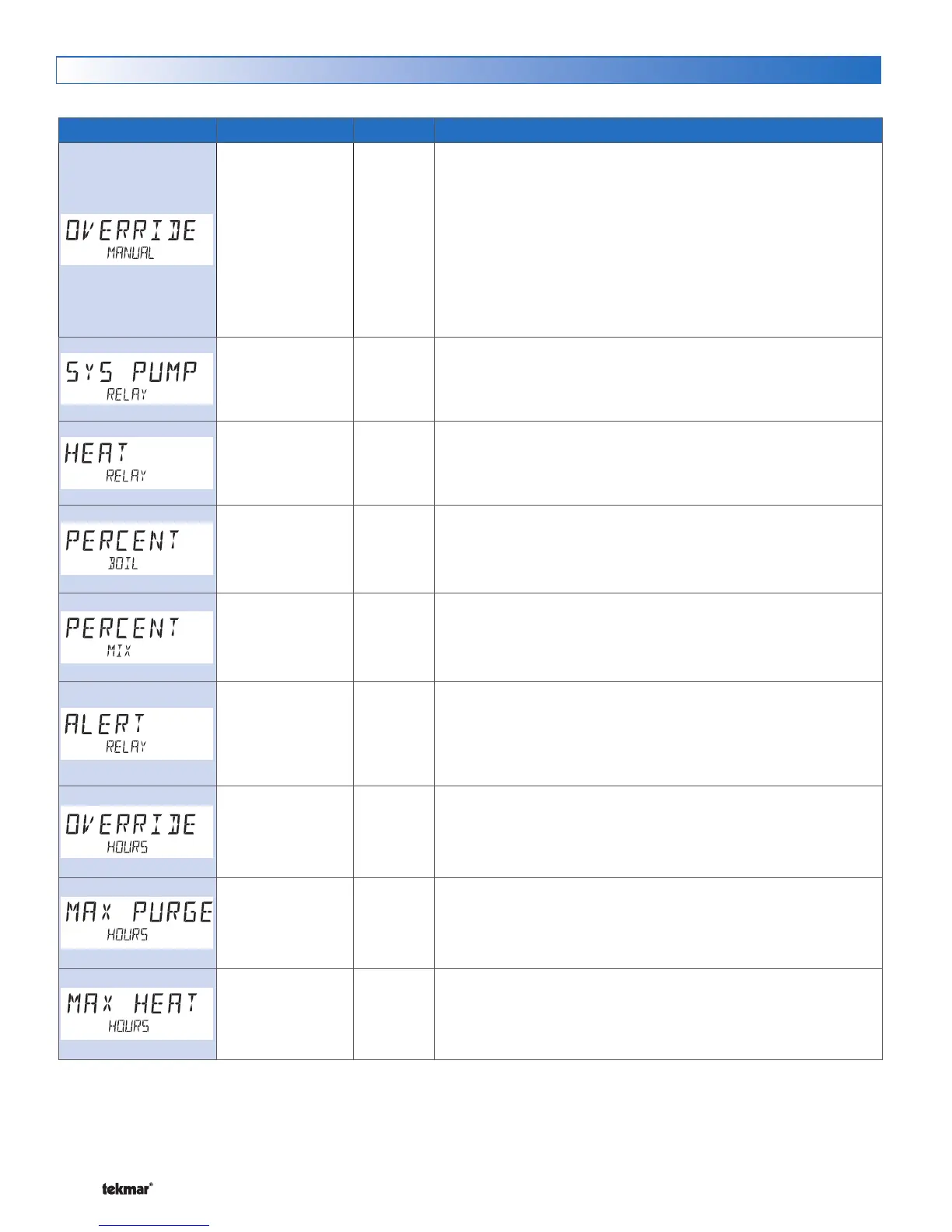 PRGE = Hydronic system purge operates pumps to help bleed air