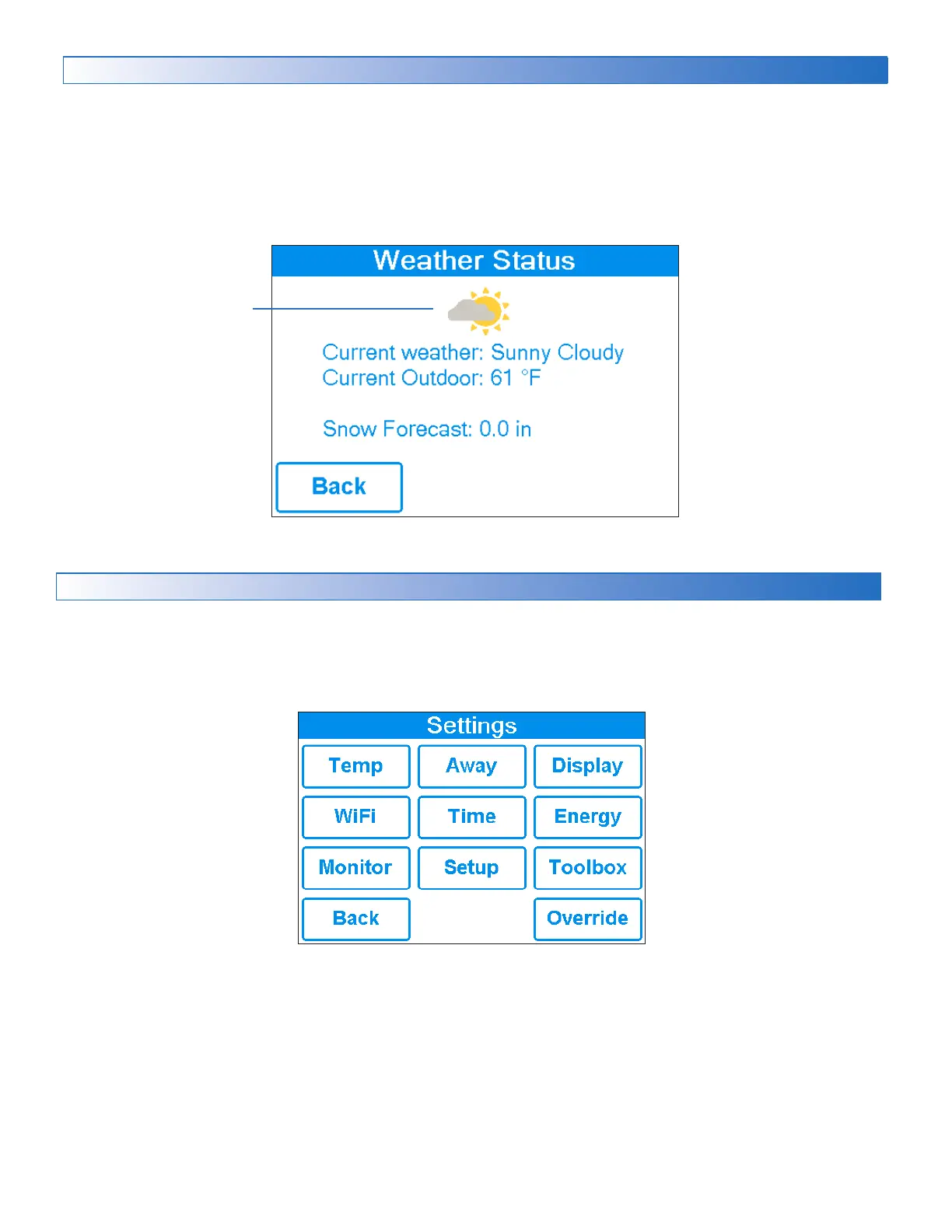 When WiFi is turned on, the control receives weather data from the Internet. The current weather, outdoor temperature and