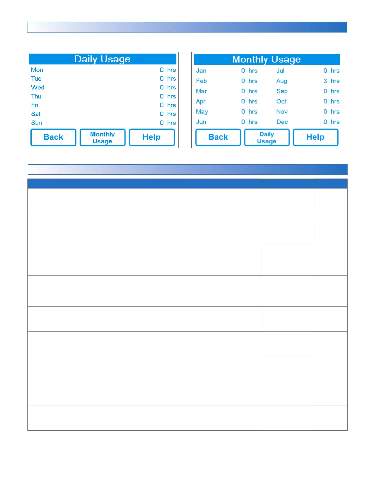 Amount of time the system has been on in hours per day. Amount of time the system has been on in hours per month.