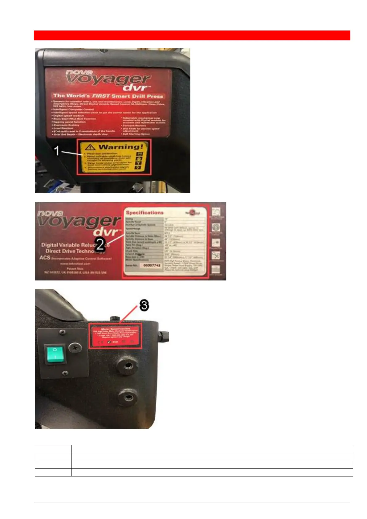 Teknatool Nova Voyager DVR - Pictograms, signs and labels; Warning labels on the machine