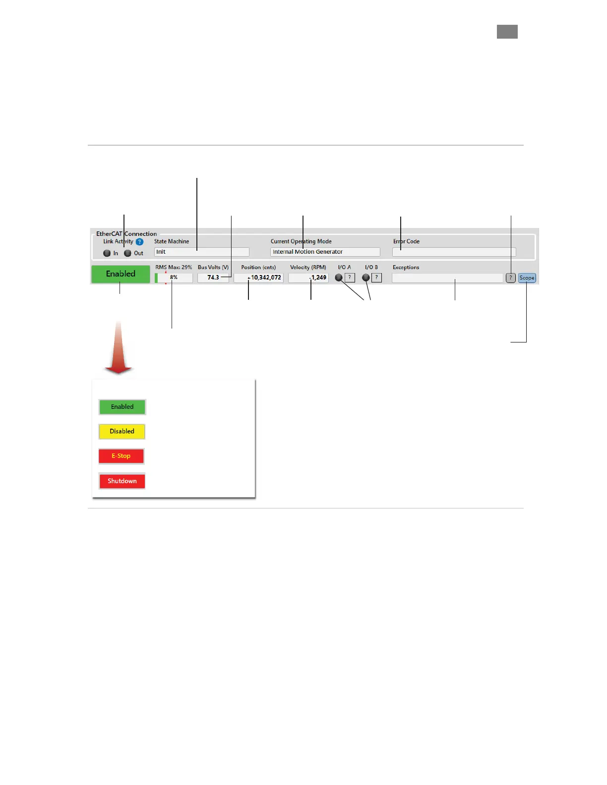 information including motor status, encoder position, motor velocity, bus