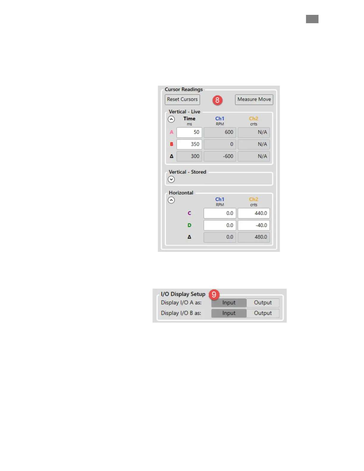 8 Cursor Readings Displays time and amplitude measurements of the