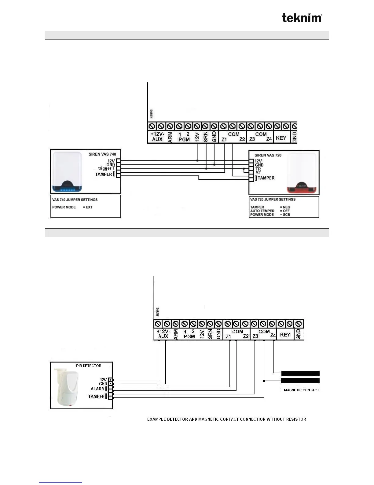 example of PIR detector and magnetic contact connection by using none end of line resistor connection.