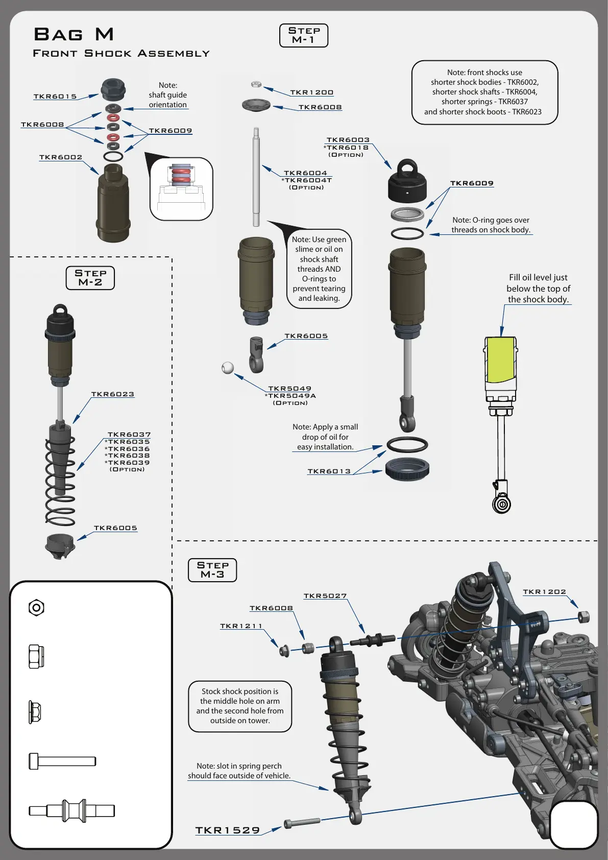 Tekno RC EB48 - Bag M: Front Shock Assembly; Front Shock Components; Front Shock Assembly & Installation