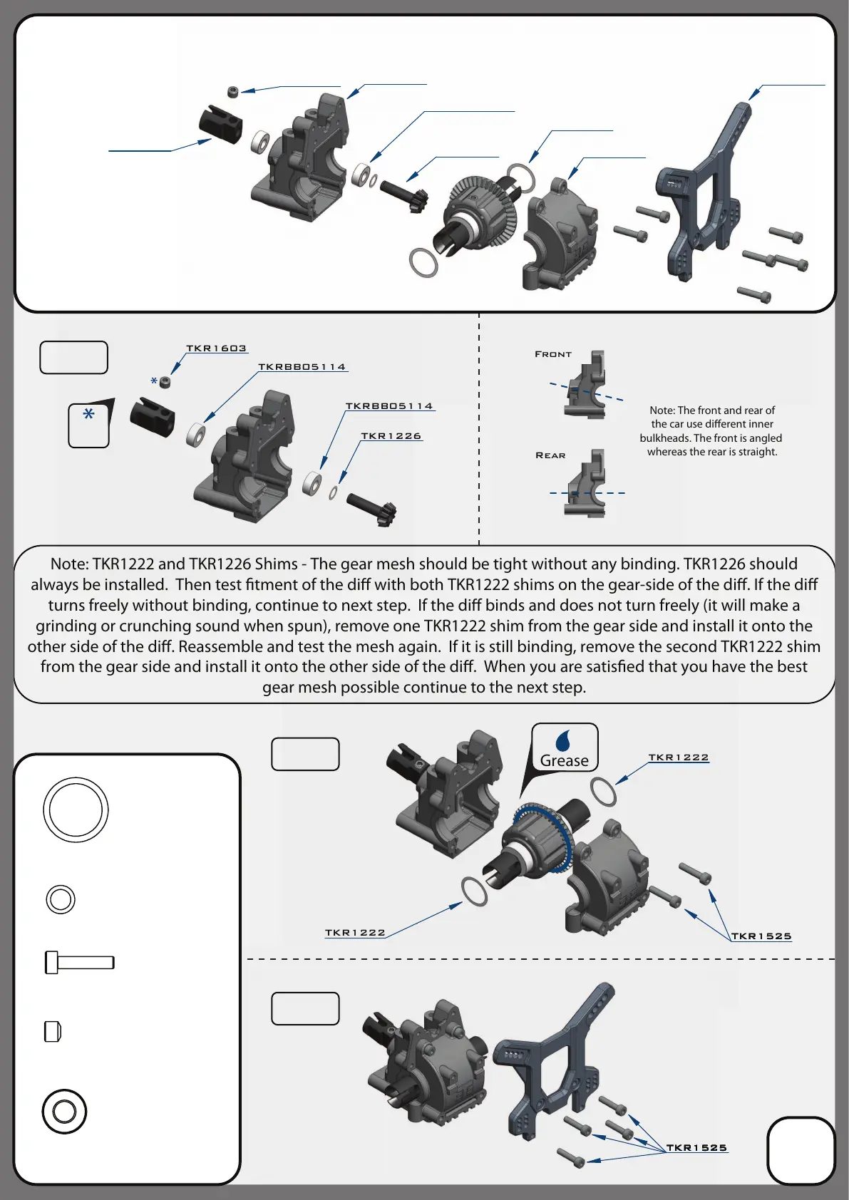 Note: TKR1222 and TKR1226 Shims - The gear mesh should be tight without any binding. TKR1226 should