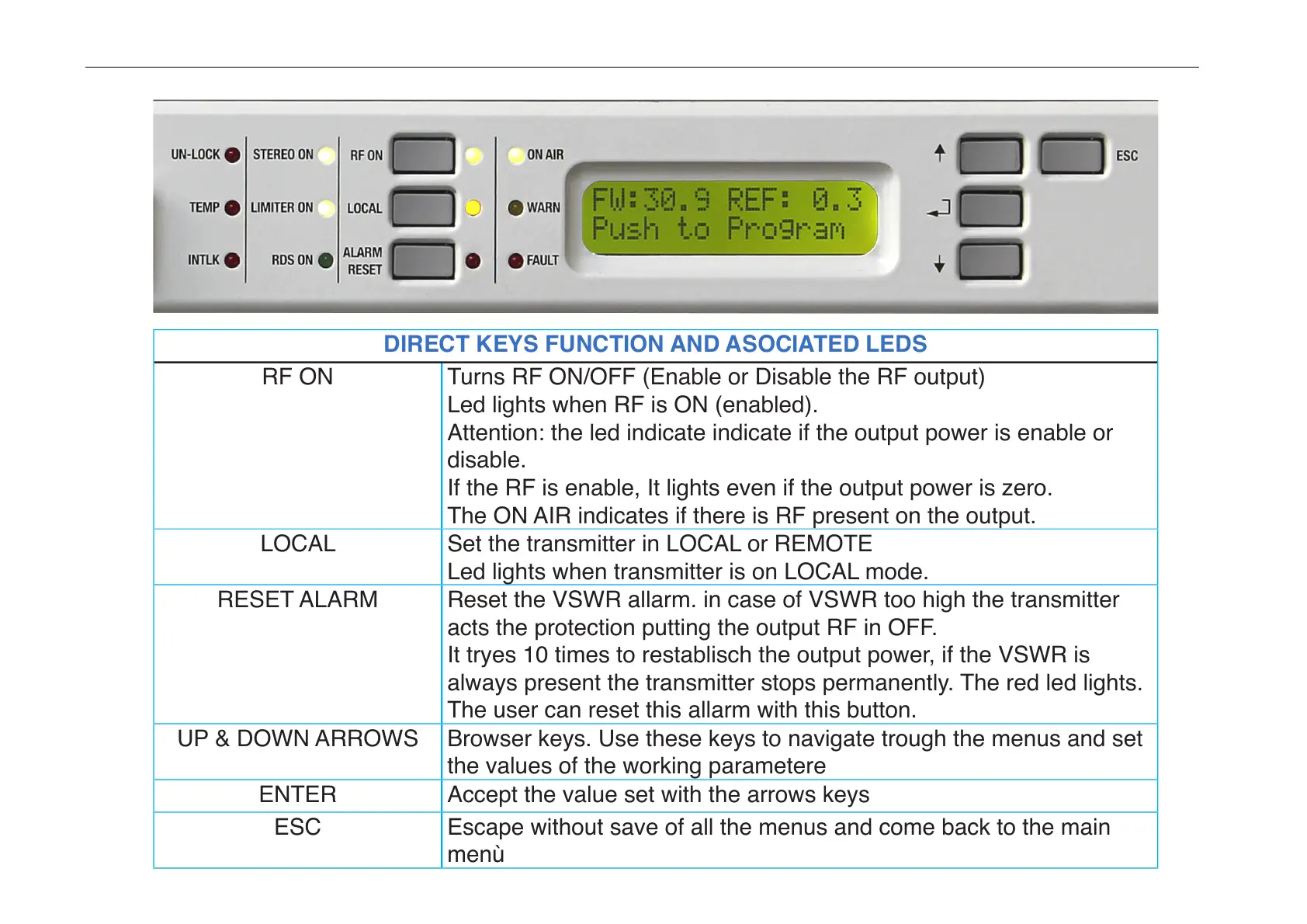 RESET ALARM Reset the VSWR allarm. in case of VSWR too high the transmitter