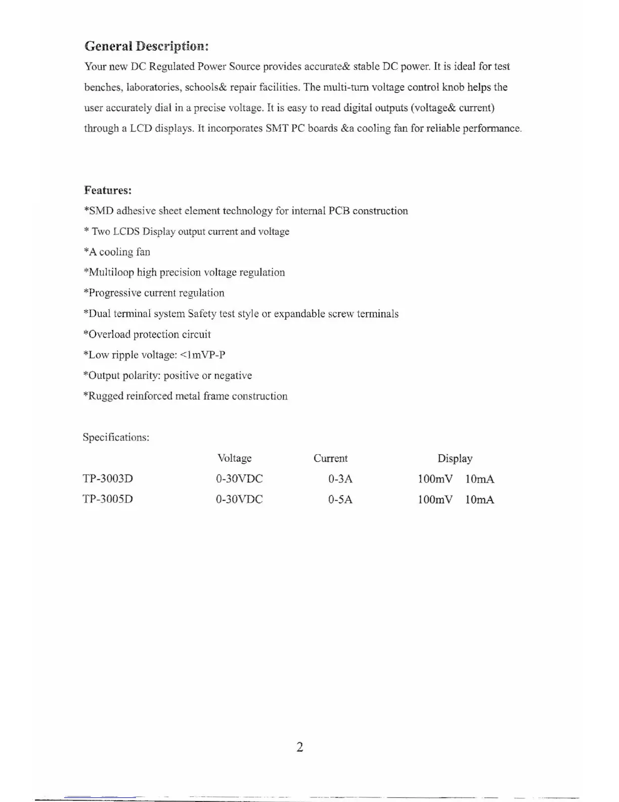 TekPower TP-3003D - General Description and Features