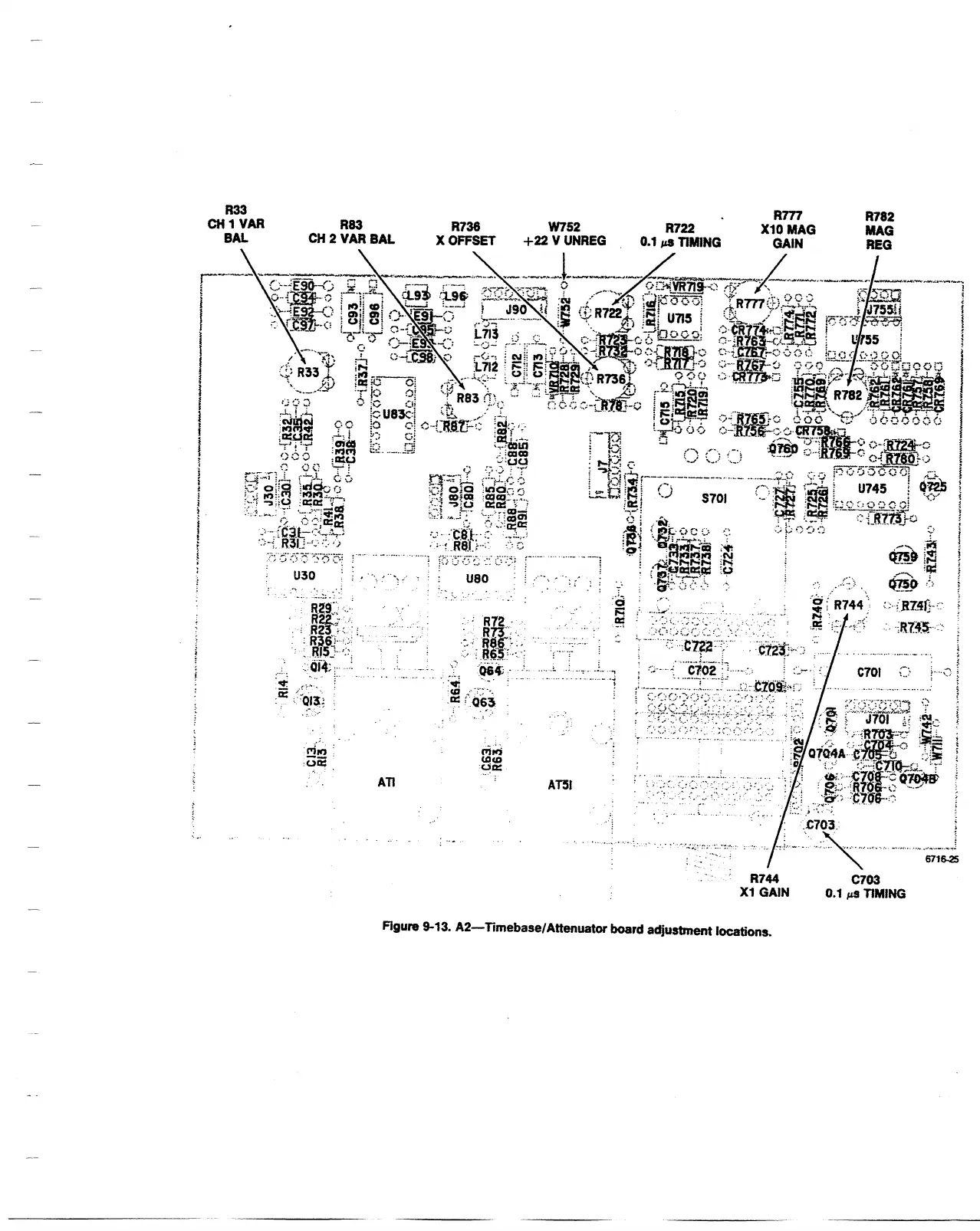 Figure 9-13. A2 Tim ebase/Attenuator board adjustm ent locations.