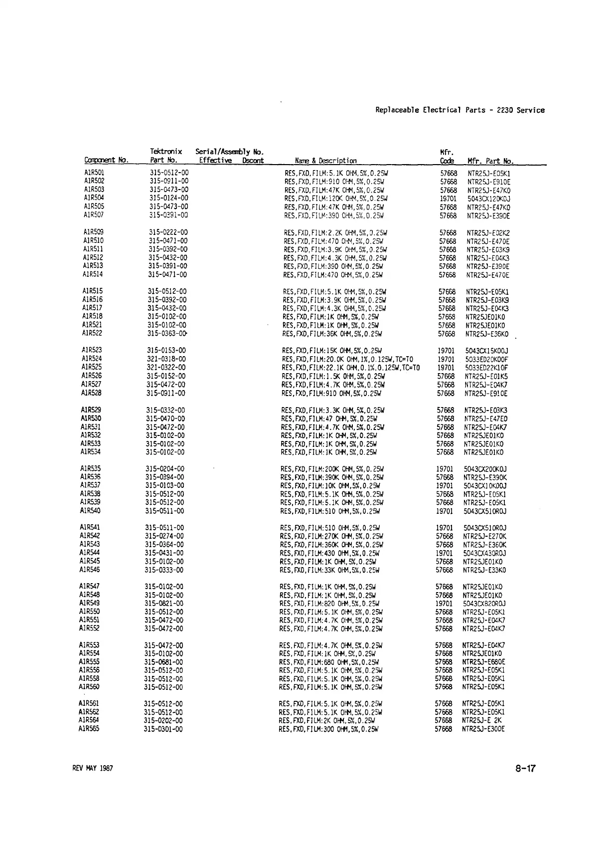 315-0512-00 RES,FXD,FILM:5 .IK 0HM,5%,0.25W 57668 NTR25J-E05K1