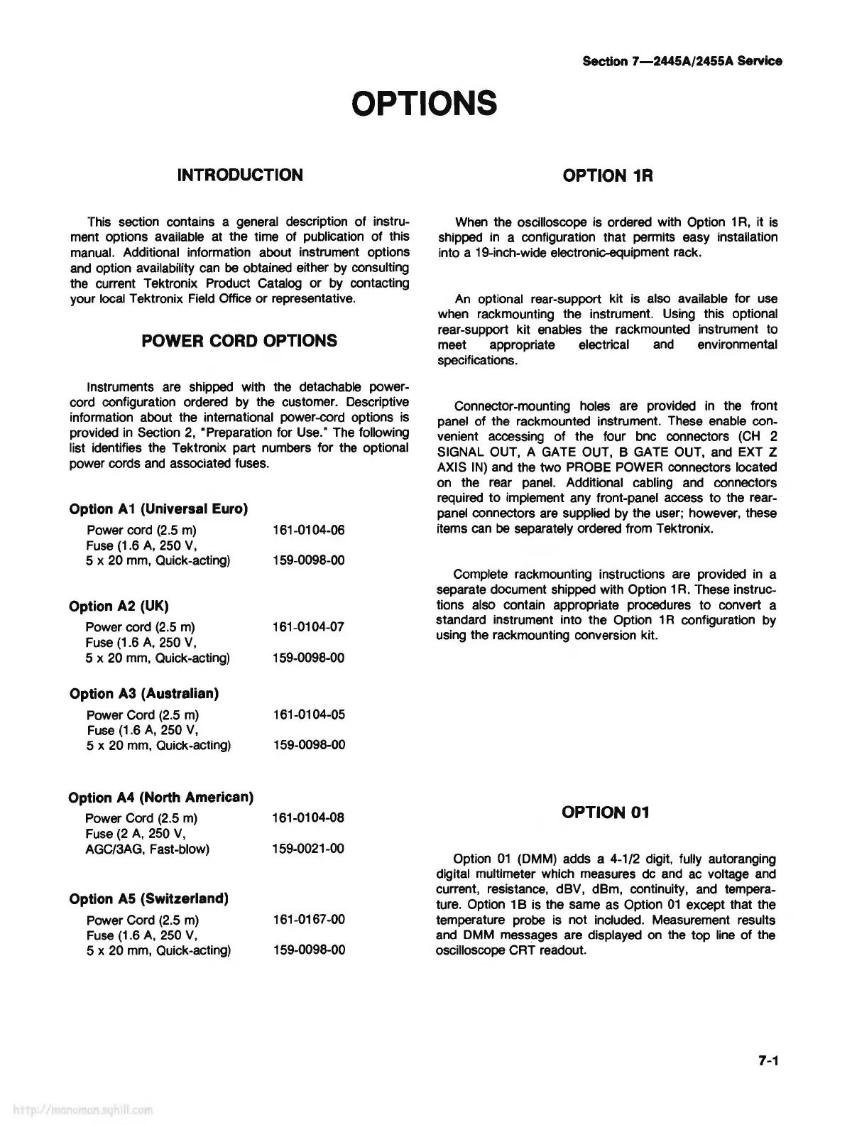 Tektronix part numbers for the optional