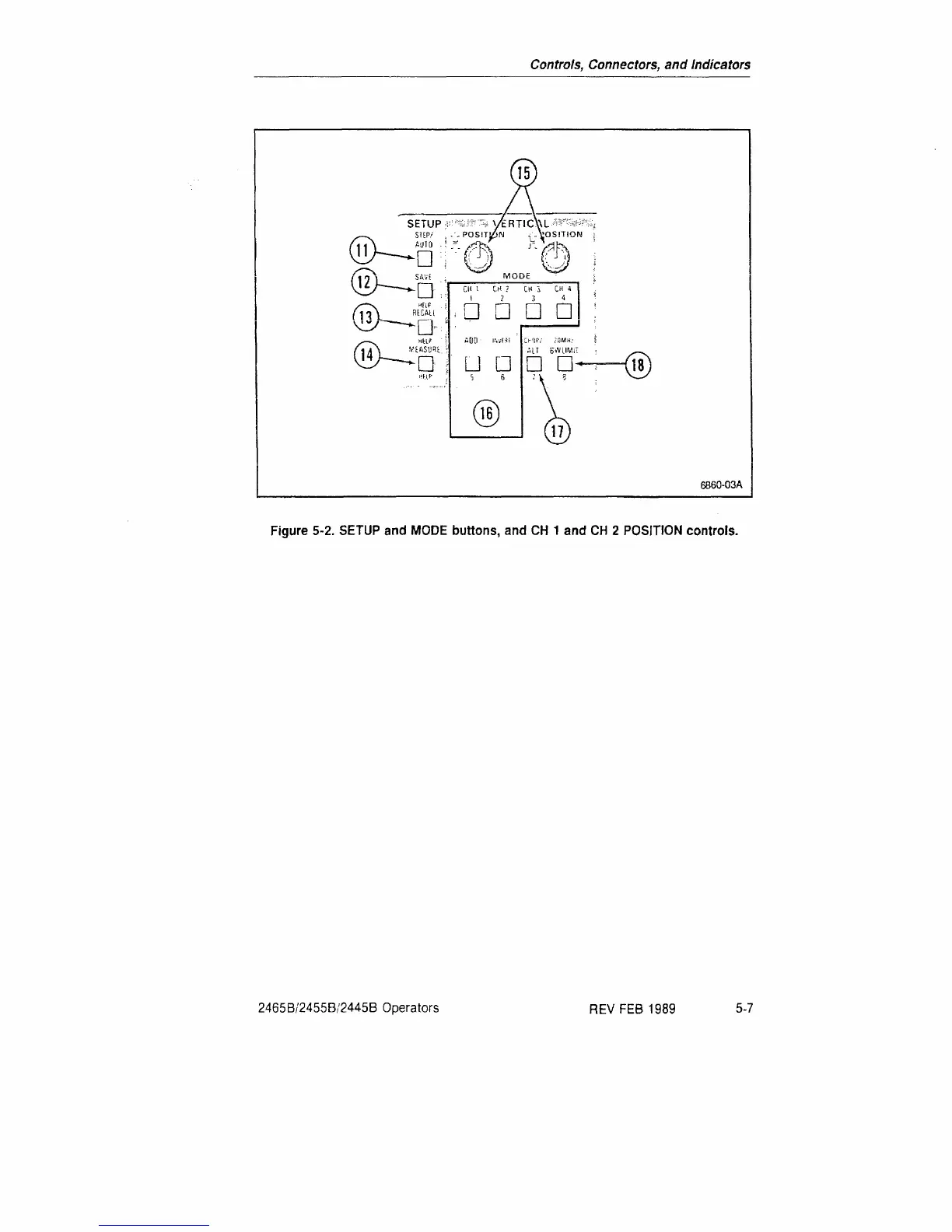 Figure 5-2. SETUP and MODE buttons, and CH 1 and CH 2 POSITION controls.