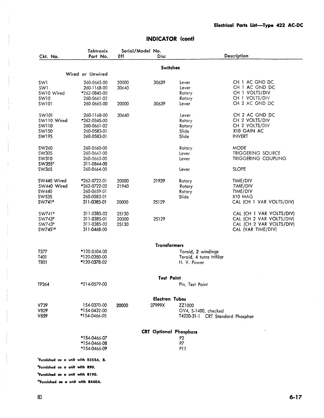 Electrical Parts List— Type 422 AC-DC