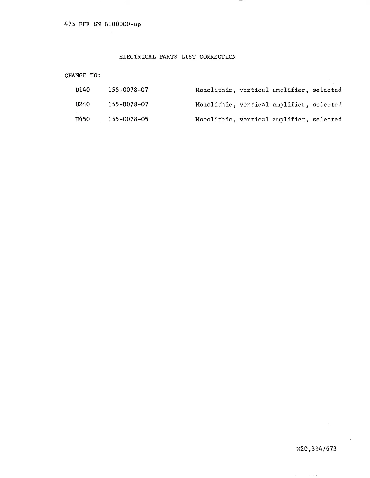 ELECTRICAL PARTS LIST CORRECTION