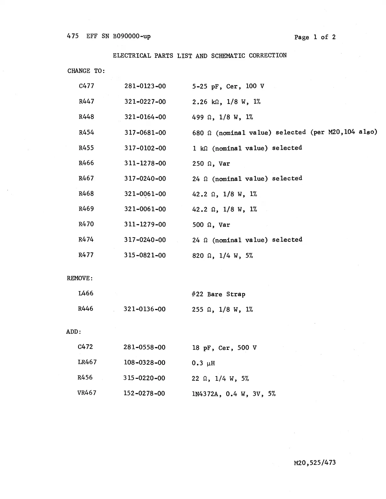 ELECTRICAL PARTS LIST AND SCHEMATIC CORRECTION