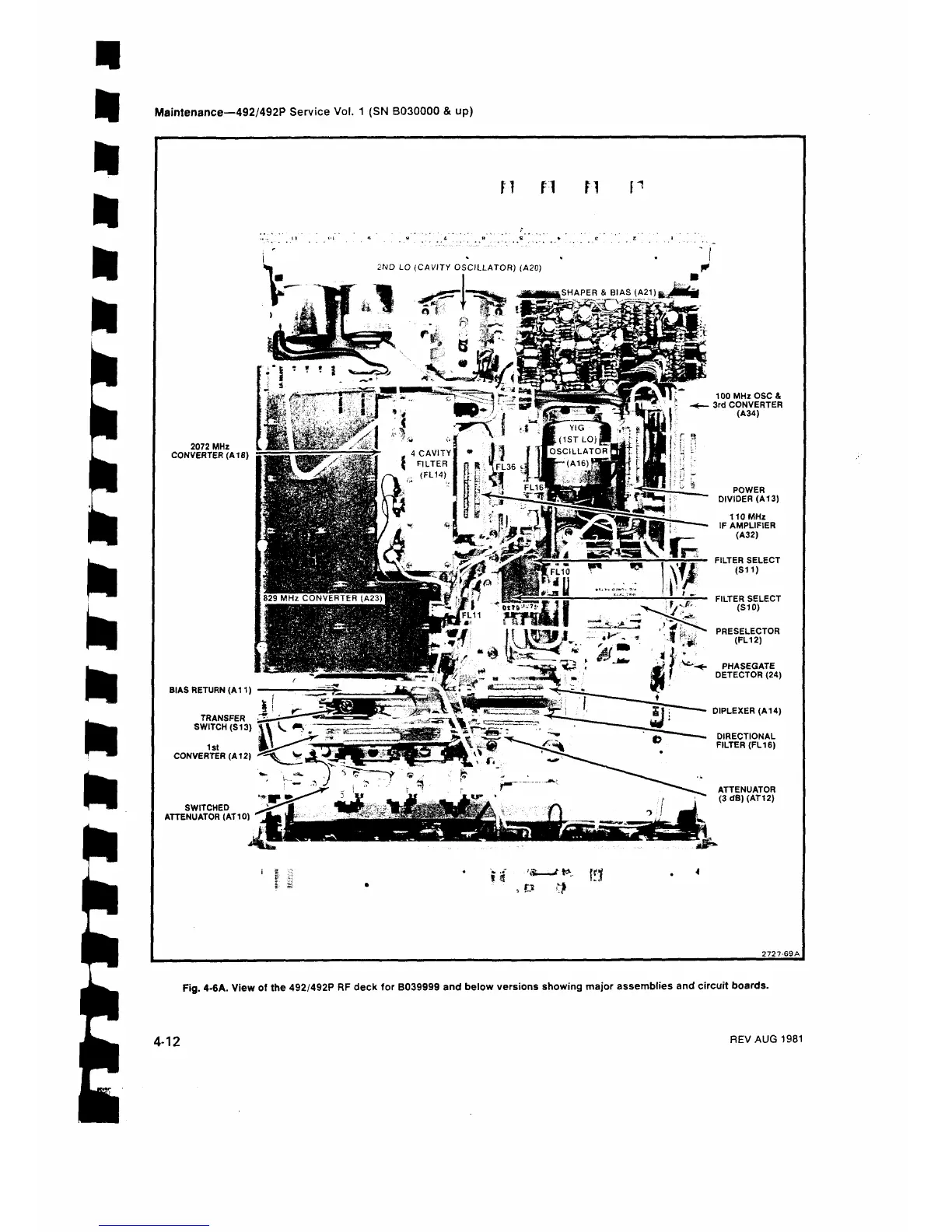 Fig. 4-6A. View of the 492/492P RF deck for B039999 and below versions showing major assemblies and circuit boards.