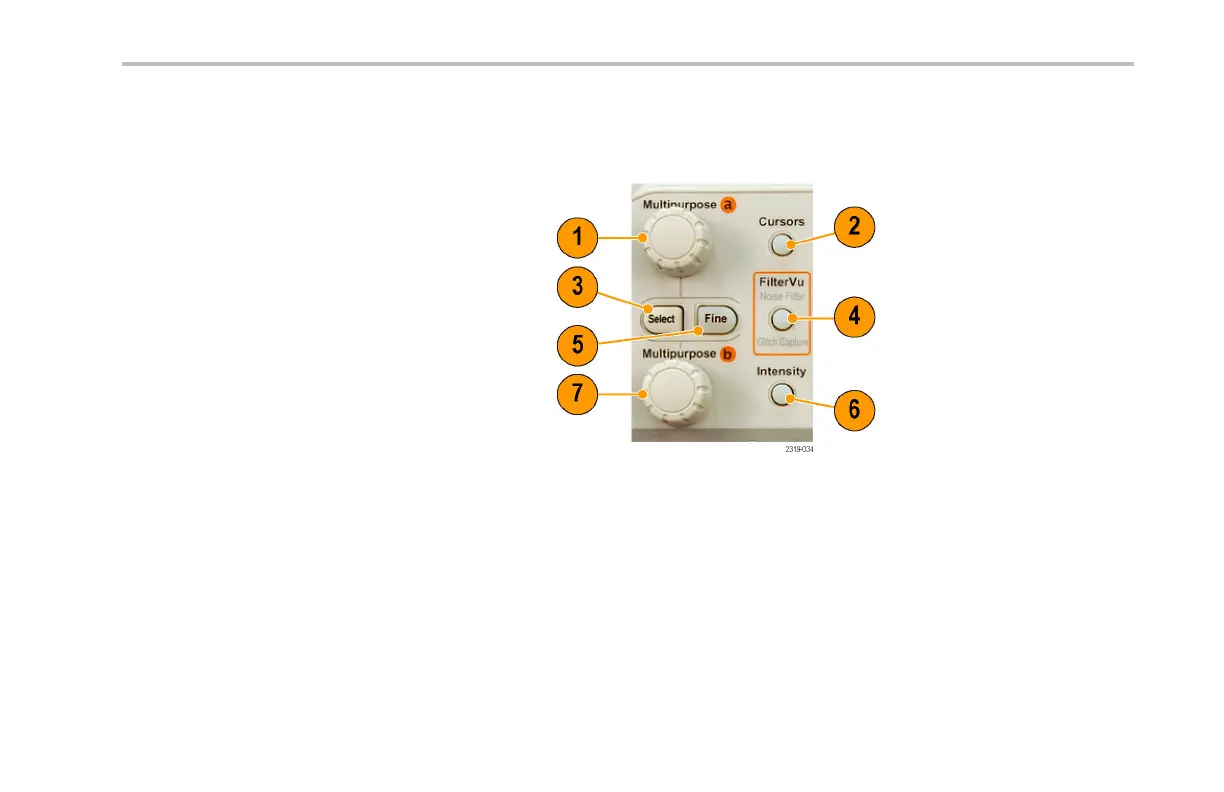 These buttons and knobs control w avef orms, cursors, and other data input.