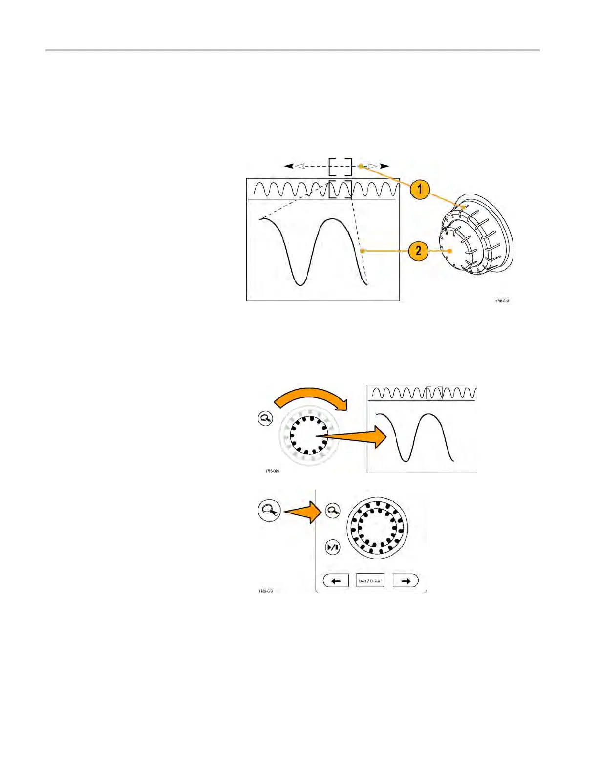 waveforms. To magnify a waveform horizontally, turn the Zoom knob. To scroll through a zoomed waveform, turn the