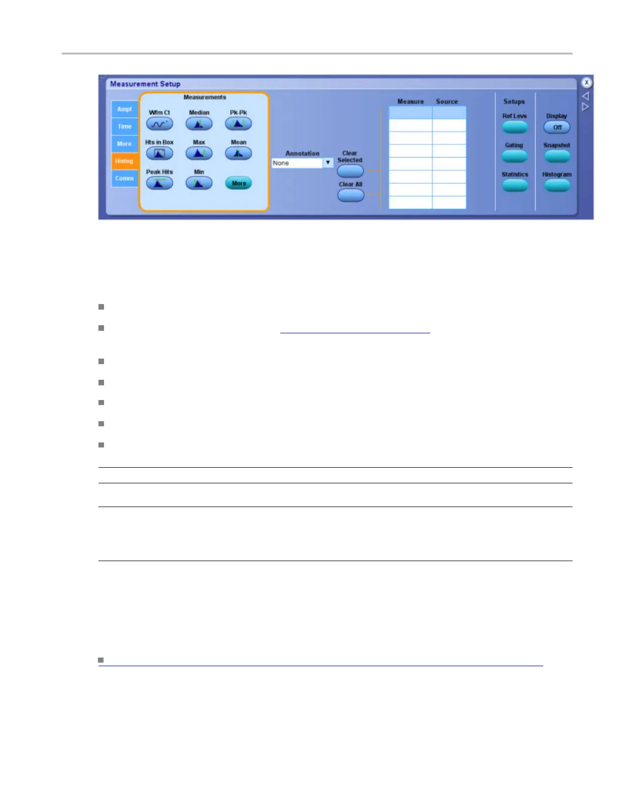 Create a list o f measurements to appear in the main graticule or in a separate measurement window.