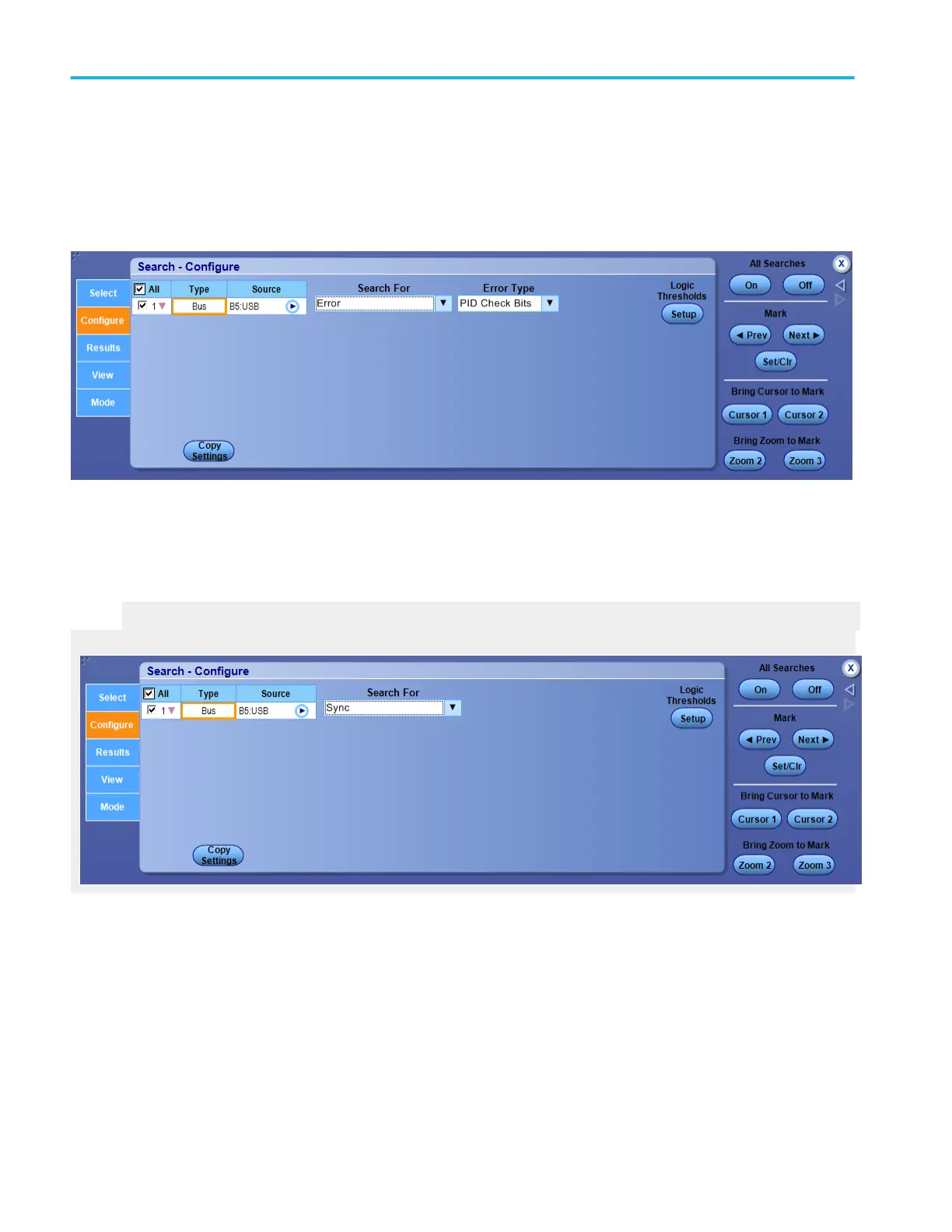 Click the Search For selections Sync, Reset, Suspend, Resume, End of Packet, Token (Address) Packet, Data Packet,