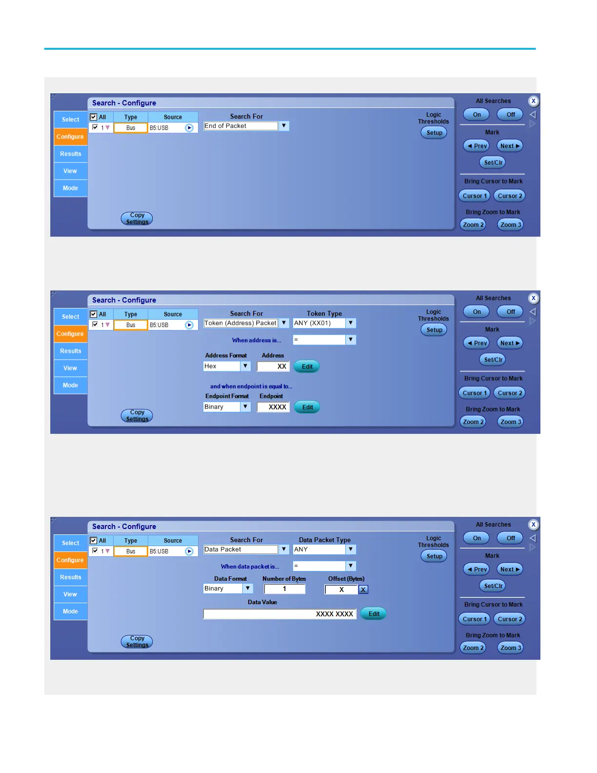 The data packet options available in Search For Data Packet are Data Packet Type, When data packet is. Number of Bytes, Data