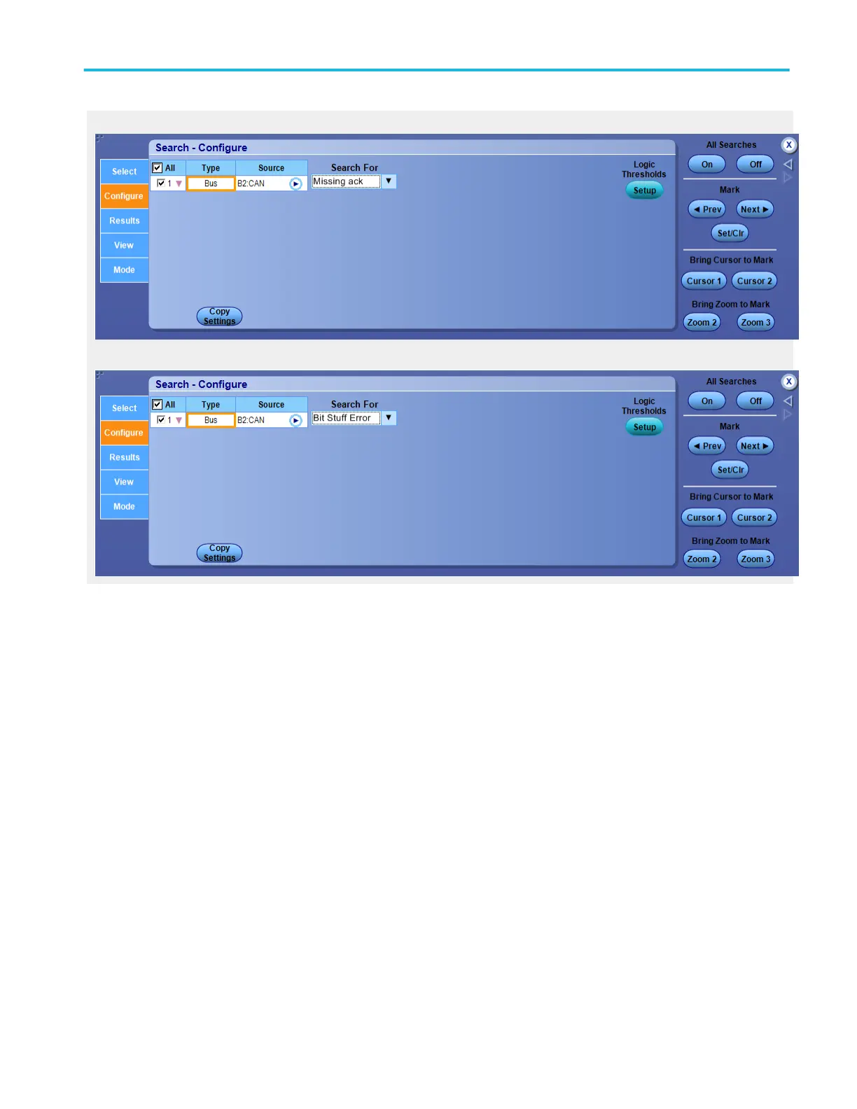 After setting up an LIN bus, go to the Analyze menu, select Search, and then select the Bus trigger type; then open the Configure