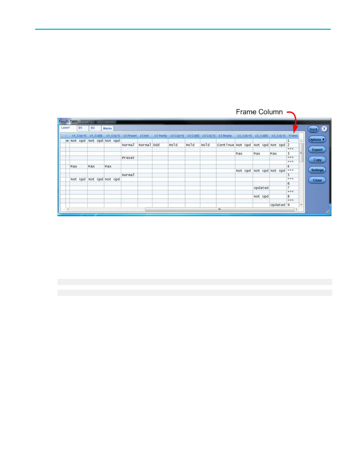 The oscilloscope captures the Link Training information into a Results Table in real-time, and displays the marked and decoded