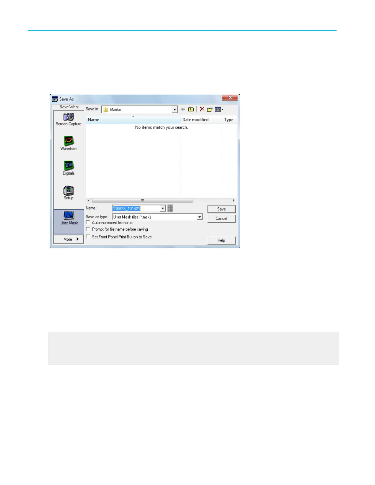 Overview. Use this dialog box to save user masks. Masks are saved in C:\Users\[Username]\Tektronix