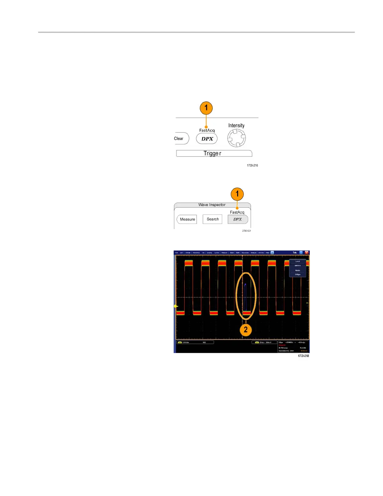 events such as glitches or runt pulses. Fast acquisition mode can also display waveform phenomena at an intensity that